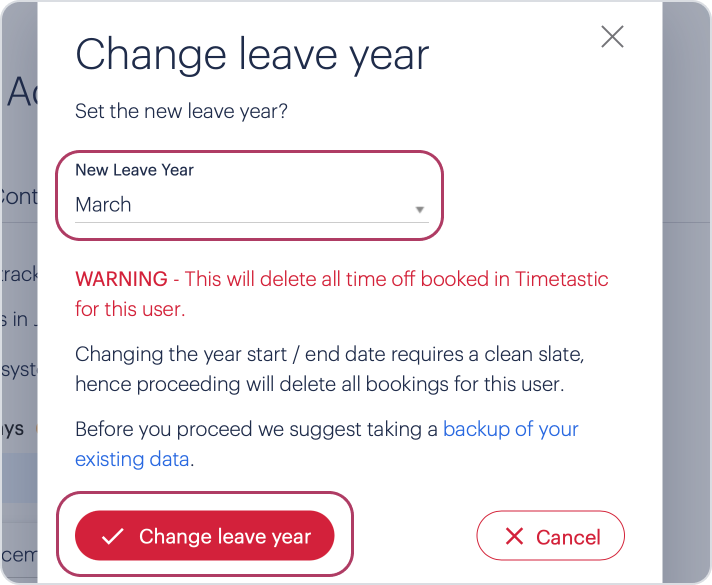 Select the new leave year start date from the drop down then click 'Change leave year'.