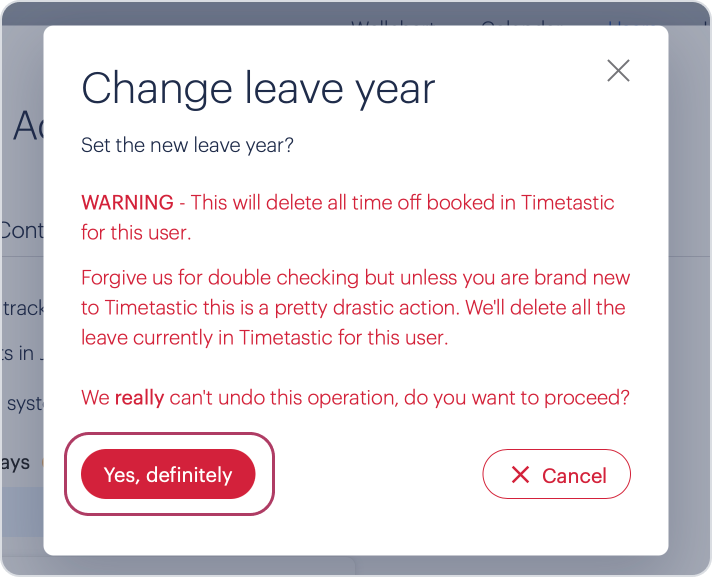 With this being a big change, Timetastic asks for confirmation that you want to go ahead. Click 'Yes, definitely' to complete the process.