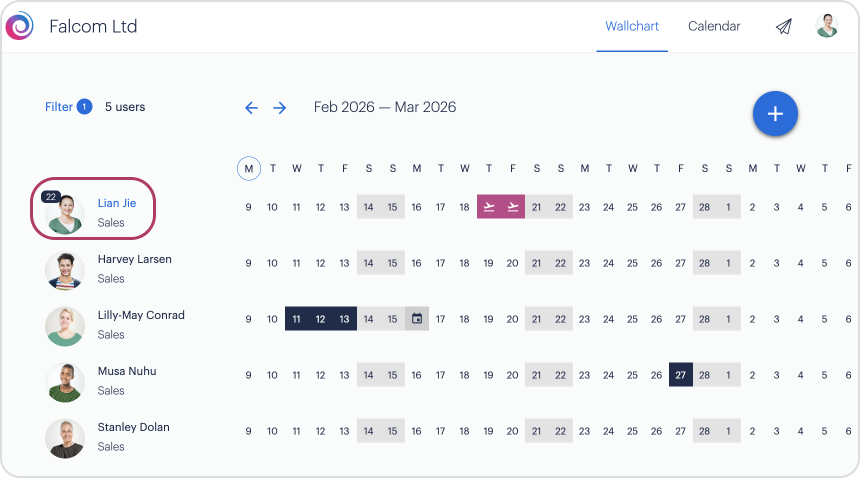 - The Wallchart shows all staff and when they are absent. By default, most leave types are set to 'private' which means users will be able to see their co-workers are off, but they won't know why they are absent. Employees can only see their own remaining allowance, eg: