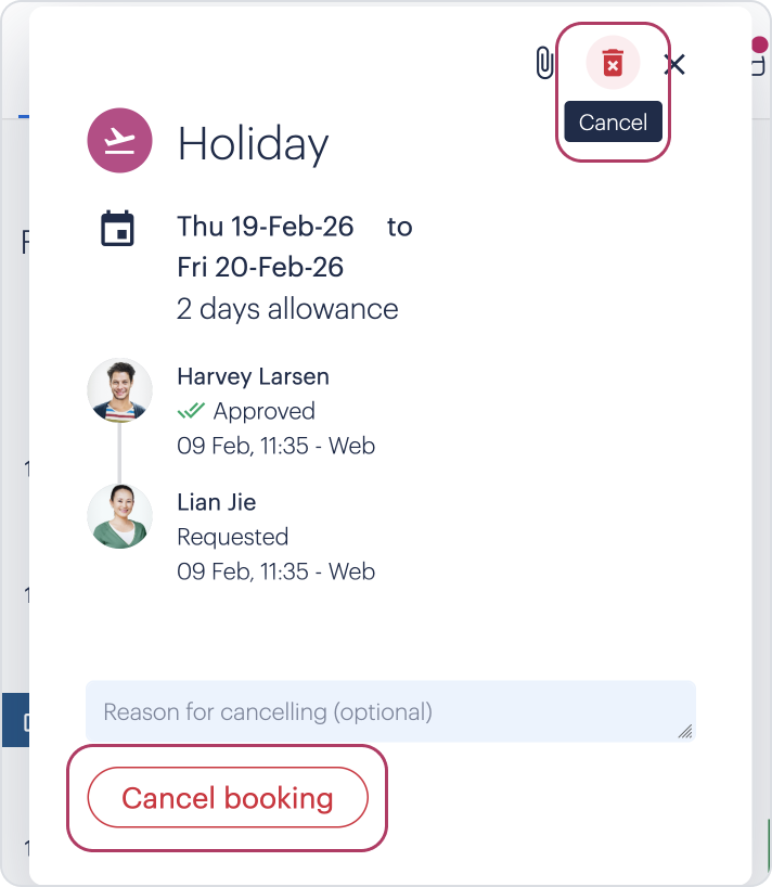 Employees can cancel their own future bookings, but they’re unable to cancel leave that falls on today’s date or in the past.