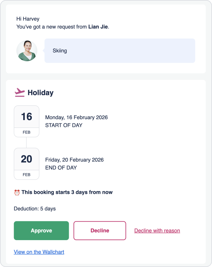 Click 'Book', and you’re done. The date is automatically approved and everyone gets an email to let them know.